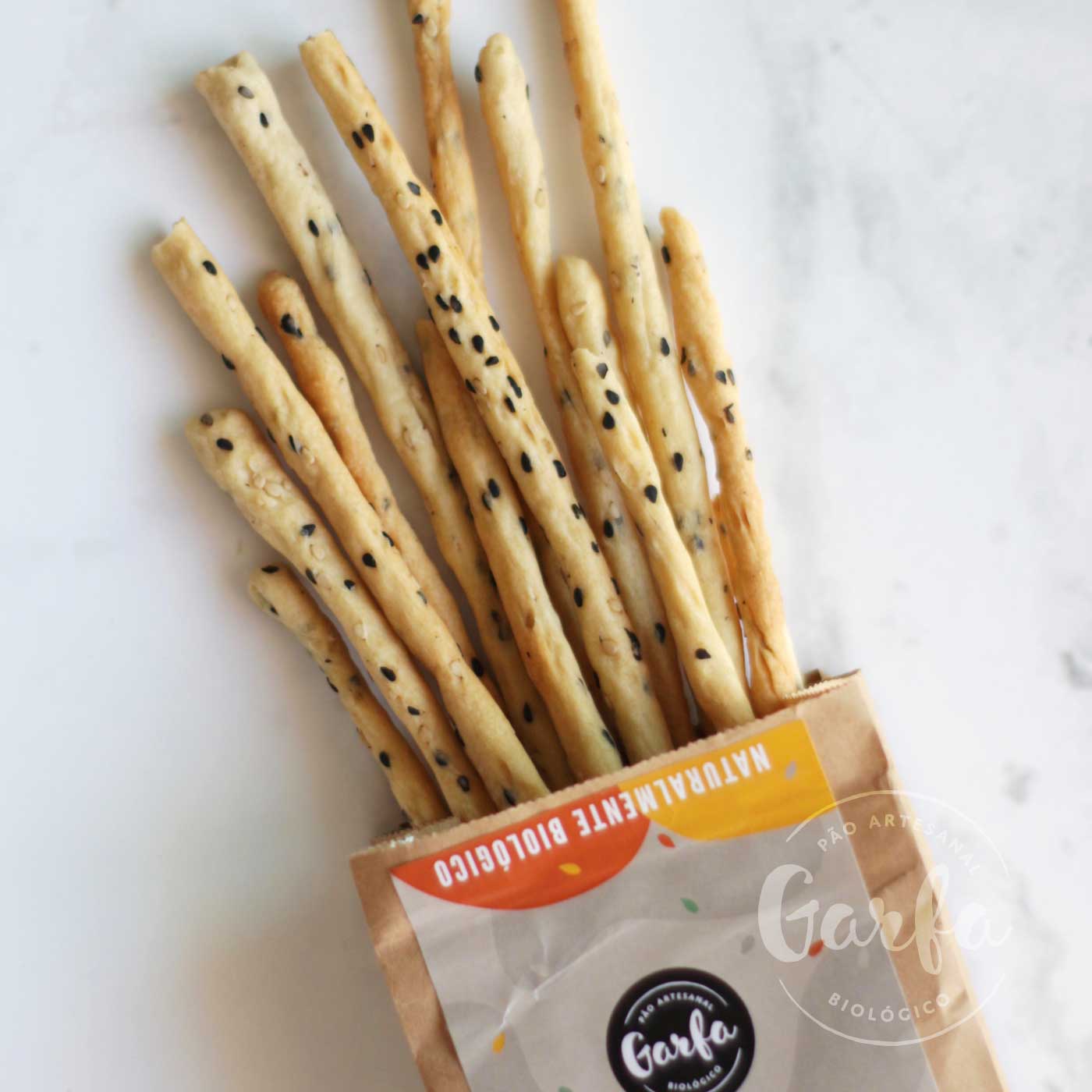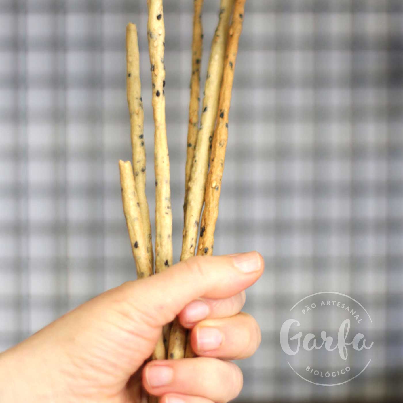 Trata-se de palitinhos de massa de pão esticados de forma manual. São um snack estaladiço que poderá comer num lanche, numa entrada de uma refeição ou simplesmente quando lhe der aquela vontade. Ficam lindos na mesa e também são uma oferta original. Feitos com farinha de trigo kamut, massa mãe de farinha de trigo, água, sementes de sésamo natural e negro, azeite e sal.